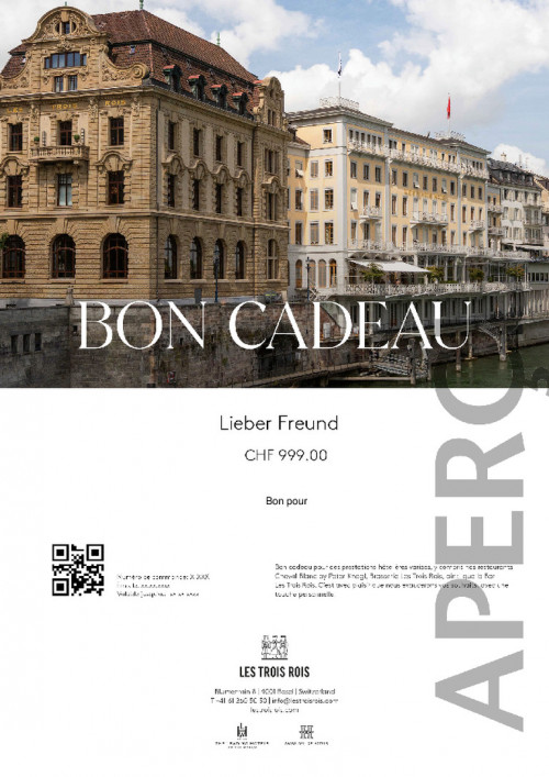 Faites plaisir avec un bon cadeau et offrez nos prestations hôtelières variées, y compris nos restaurants Cheval Blanc by Peter Knogl, Brasserie Les Trois Rois, Banks Basel, ainsi que le Bar Les Trois Rois et le salon à cigares « The Council ».