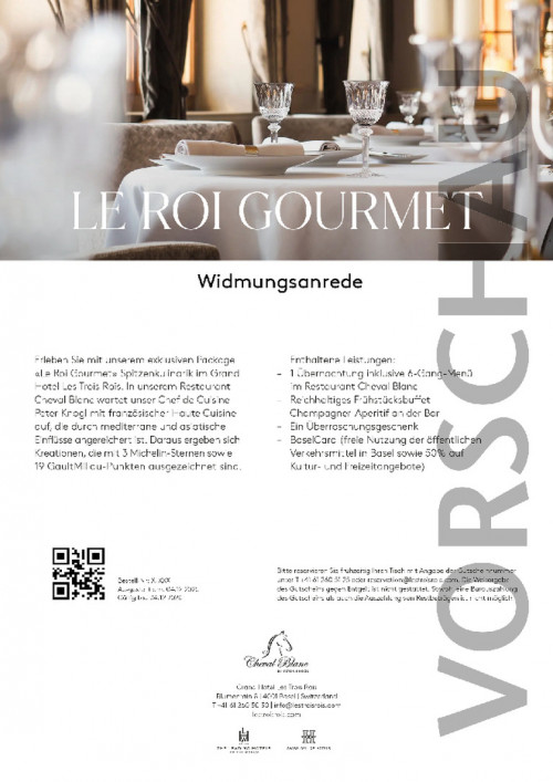 Bitte beachten Sie, dass das Restaurant Cheval Blanc am Sonntag, am Montag sowie am Dienstagmittag geschlossen hat. Das Package «Le Roi Gourmet» ist auf Anfrage und nach Verfügbarkeit buchbar.