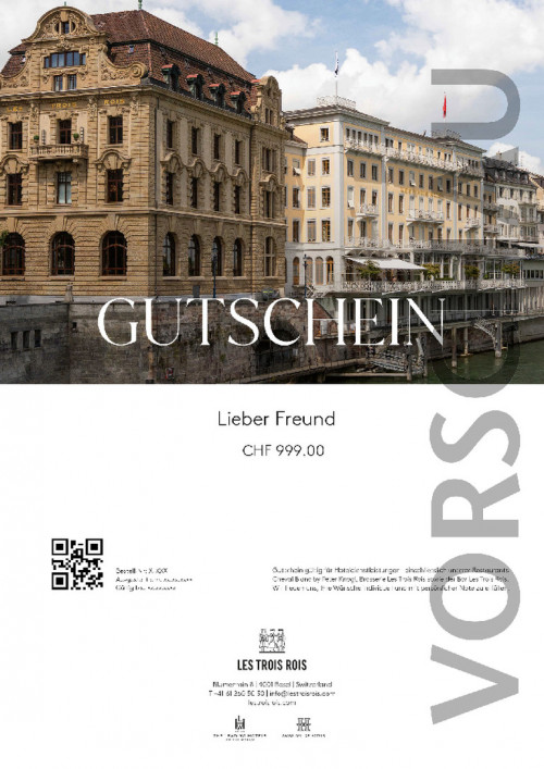 Bereiten Sie Freude mit einem Gutschein und verschenken Sie unsere vielfältigen Hoteldienstleistungen einschliesslich unserer Restaurants Cheval Blanc by Peter Knogl, Brasserie Les Trois Rois, Banks Basel sowie der Bar Les Trois Rois und der Zigarrenlounge "The Council".